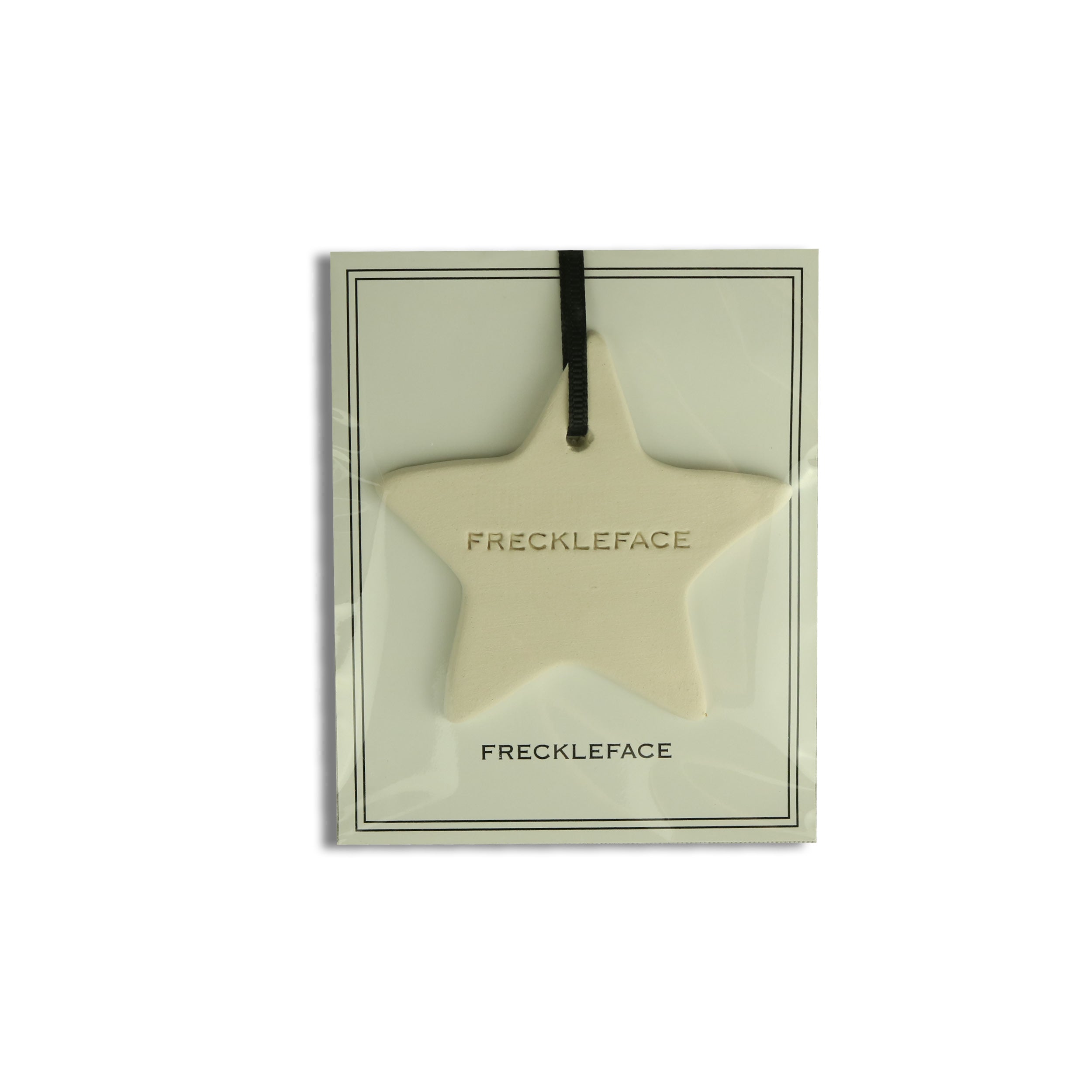 White ceramic star with our Freckleface logo embossed on to it by hand, finished with a 3mm black satin ribbon .