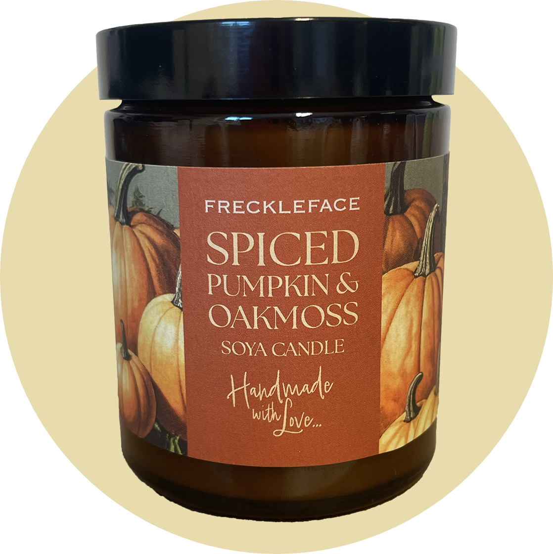 Handcrafted soya wax candle in amber glass vessle with black lid.